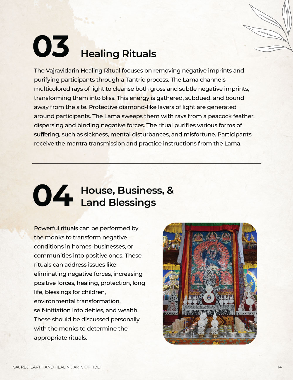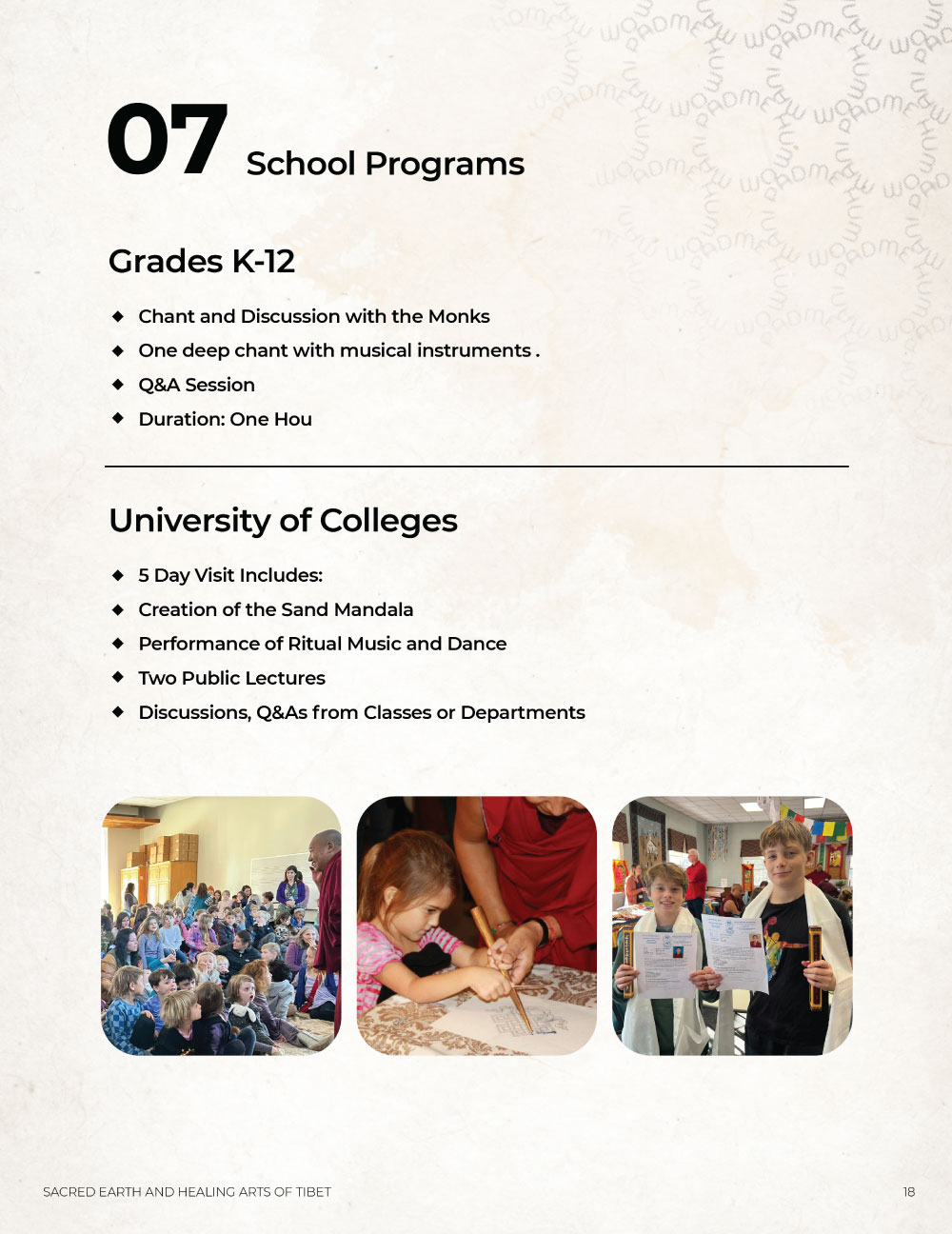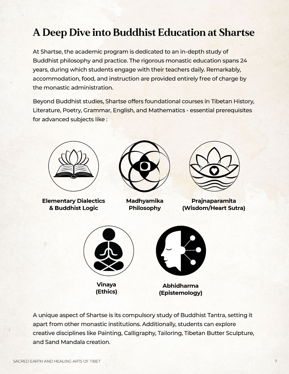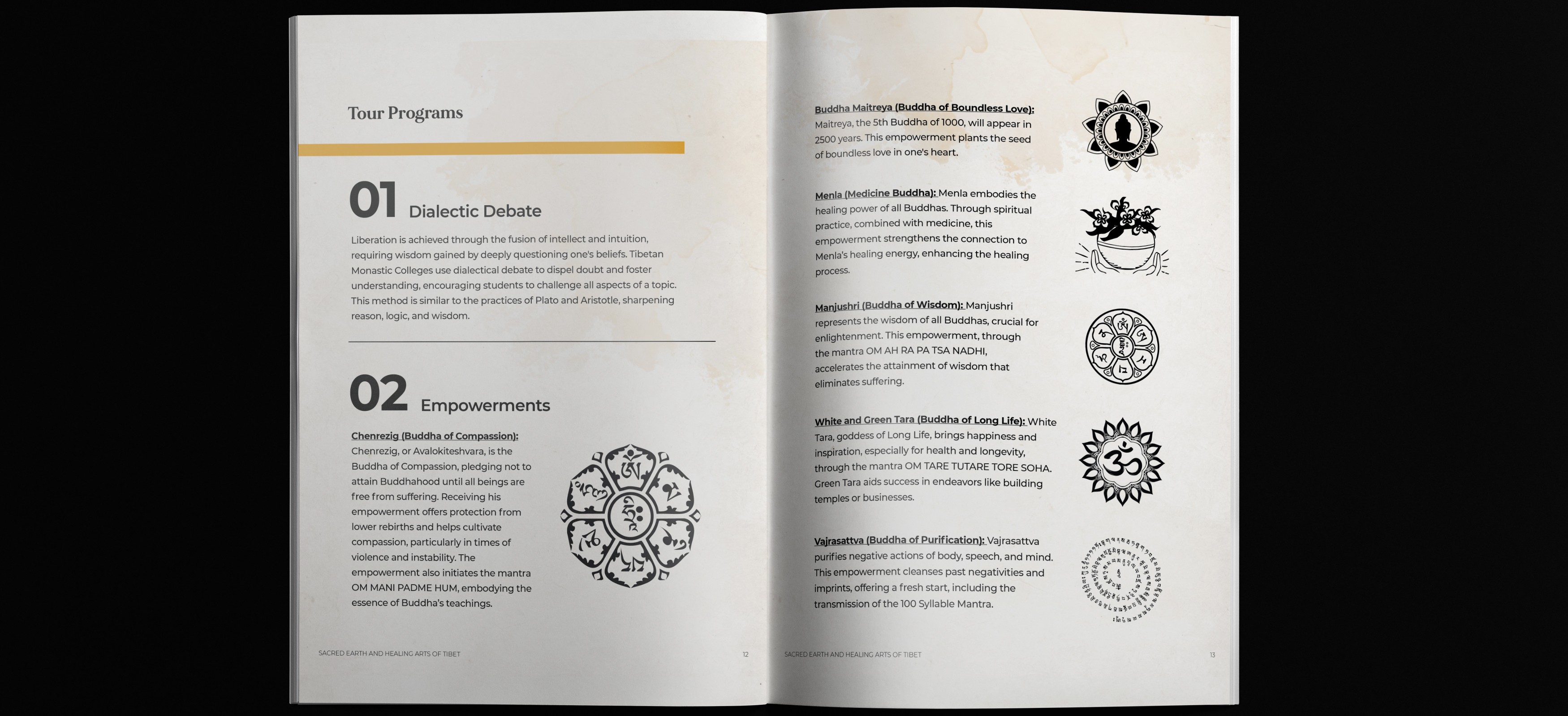To transform the monastery’s originally dense, text-only content into a professional editorial experience, I implemented a strict typographic hierarchy. By replacing blocks of text with descriptive headers, subheaders, and bulleted lists, I ensured media members can skim for key context. I also integrated icons and mandala inspired motifs as a visual break system to guide the reader through the document. These elements were designed as modular assets, allowing the monastery to repurpose the icons and graphics for social media, event banners, and tour posters.