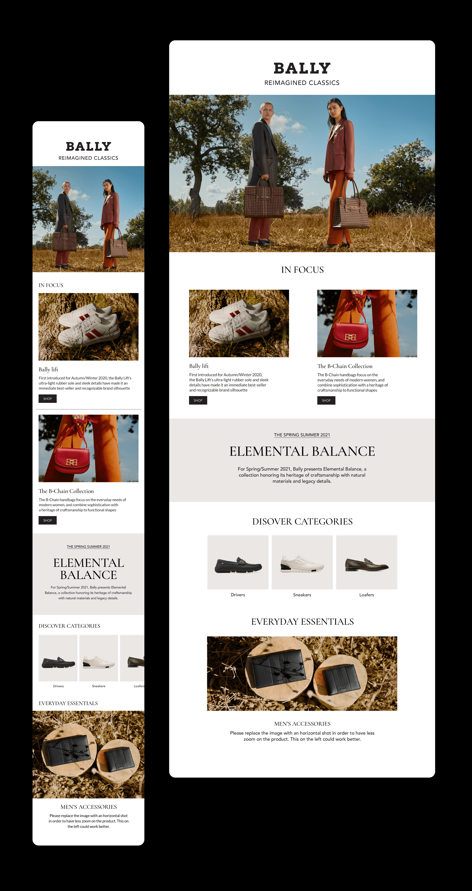 Designed multichannel marketing assets including newsletters, paid ads, and push notifications to drive traffic for major sales and exclusive launches, maintaining a high-end aesthetic with clear CTAs to maximize conversions.
