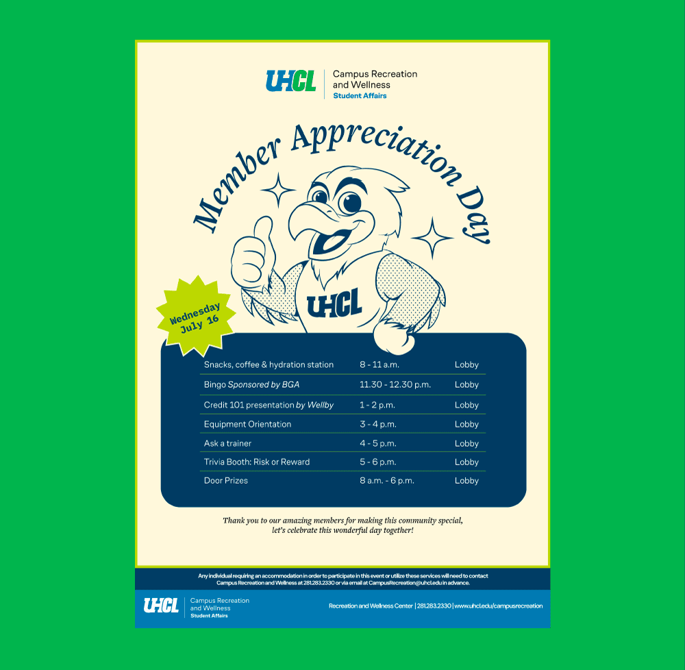 UHCL Campus Recreation and Wellness Center is the primary hub for student health and physical engagement at the University of Houston Clear Lake. The department provides diverse programming, from competitive sports to wellness initiatives. My objective was to modernize the department's visual communication and develop a marketing strategy to better engage a diverse student body. This case study showcases a full-scale plan, including high-impact campaigns, social media content, and other marketing efforts designed to elevate the department's presence on campus and drive community membership.